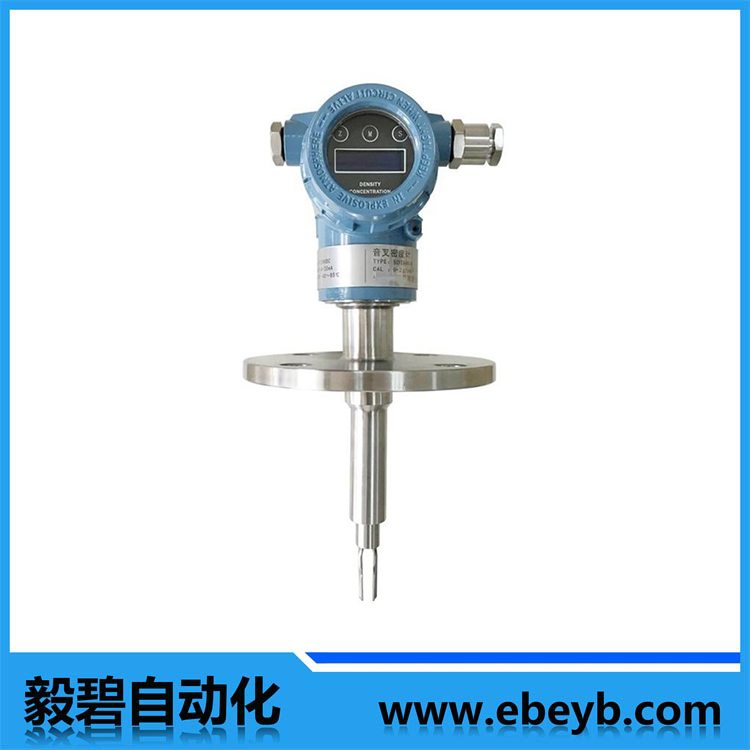 EB5300 系列在線密度、濃度計,是使用聲波頻率信號源對金屬音叉進行激勵,并使音叉處于中心頻率下自由振動,此頻率與接觸液體的密度有著相聯(lián)對應關系,因而通過對頻率的分析可測量液體的密度,再進行溫補可消除系統(tǒng)的溫漂; 而濃度則根據(jù)對應液體密度和濃度的關系式可計算出20℃溫度下的濃度值。